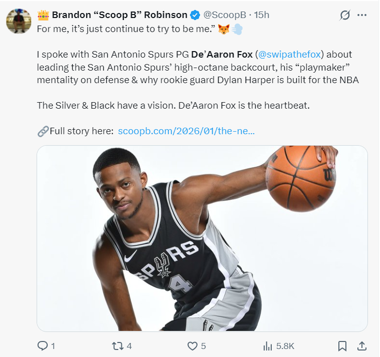 在这场比赛之前,福克斯刚刚接受了Scoop B的专访,福克斯表示在马刺这支充满后场球员的球队打球最主要的是做自己,在防守端也要有组织者的心态,会帮助哈珀更快的适应NBA的节奏。【结果福克斯就是用18中4来做自己】