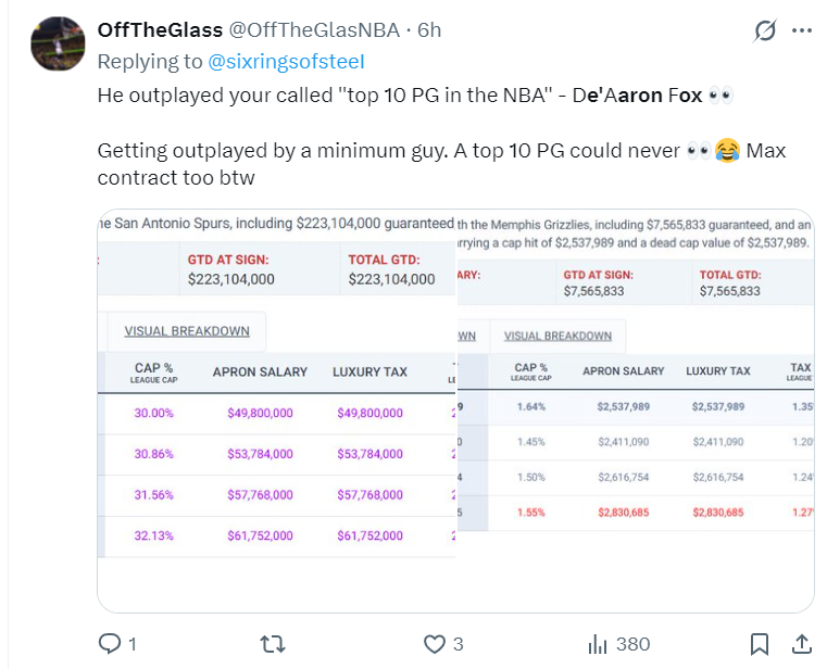 美媒:福克斯根本没有资格进入联盟前十控球后卫之列了,他被一个身材矮小的PG打得毫无还手之力,一个联盟前十的控卫不可能被压制成这样,福克斯这份顶薪合同太离谱了。